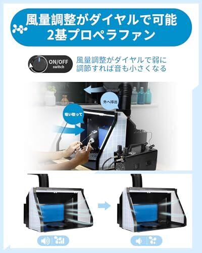 風量調整がダイヤルで可能:こちらの2基ファンスプレーブース吸引力がより一層強い。風量調節がダイヤルで可能です。 明るさ調整がダイヤルで可能:LEDライト付き LEDライトの明るさ調整がダイヤルで可能、好きな明るさを!塗装ブースの上部、左辺、右辺と3面にLEDライトが付いていますので、細かい部分までもはっきり見えて作業効率が上がり、仕上がりも良くなります。 ファンとLEDライトが別々に使え:Anesty塗装ブースは他のものと違いファンとLEDライトに個別にスイッチがありますので、独立作動が出来て大変便利になるスプレーワークシステム 。(ファンのみ作動でき&LEDライトのみ点灯でき) 広い作業スペース: ペインティングブースの開口部が広く、吸引範囲が広い、塗装するときはスプレー缶やエアーブラシが当たる心配はありません、作業性がとても良いです。※作業スペースサイズ:55×20×36cm(幅×奥行×高さ) 。 窓に設置られ排気用ダクトホース: プロペラファンが2つがあるのに、奥行きを取らない上向きの排気口が1つだけに設計されます。排気延長用のダクトホースもあり、窓からの距離があっても安心です。ホースの長さ(収納):36CM。ホースの長さ(最大まで展開):137Cm。【フィルターが交換&入手しやすい】本体にあるフィルターだけてなく、交換用フィルターを1枚同梱しています。または当店では交換用のフィルター(同じ規格)も販売しているので、フィルターの定期交換にもとても便利です。