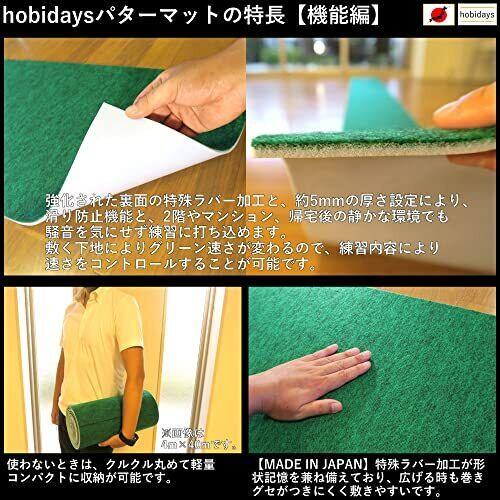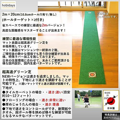 hobidays【日本製】 パターマット 超高速本格芝生 20cm×2m/30cm×3m [10.8cmホール穴有り/無し] ゴルフ ホールターゲット2枚付き 裏面滑り止め特殊加工 返球 練習器具 室内 スイング ゲート ボール 介護 業務 golf パッティング グリーン [MADE IN JAPAN]