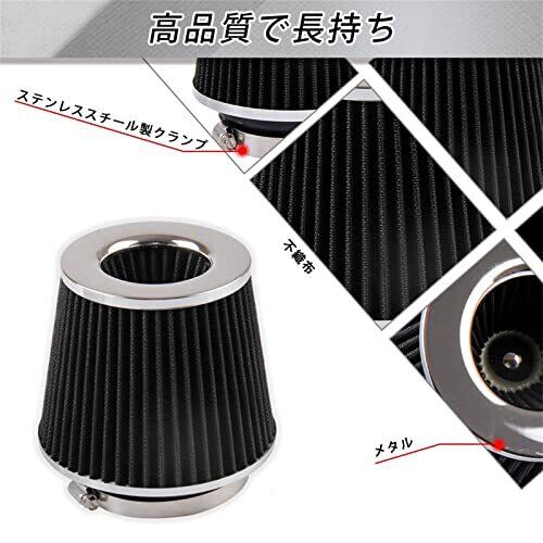 【吸気効率UP!】 -キノコ型 エアクリーナーは吸気抵抗を抑え、エンジンパワーを追求します。また、キノコ型 エアフィルターは抜群の集塵性能によって、エンジンやターボに有害な、砂、粉塵、鉄粉を漏らさず捉えます。 【高品質で長持ち】- キノコ型 エアクリーナー本体は高品質な不織布とメタル材質で作られて、ステンレススチール製のクランプは錆びにくく長持ちしています。 【水洗いだけでお手入れ超簡単】 -乾式のエアクリーナーで、お水洗いだけで、簡単に清潔できますし、汚れていたら2~3回に洗うことができリサイクルスタイルです。 【交換のチェックポイント】- 1.燃費が悪くなってきた 2.エンジンのパワー不足を感じるようになってきた 3.走行距離が4000kmになった。(走行環境により違うがあります) 【調整可能の取り付け口径】- 取り付け径:76MM・89MM・102MM。 パイプ差込部に付属のアダプターを組み替えることで、3種類のパイプ外径に対応します! 取り付け方法は【商品の画像】をご確認ください。
