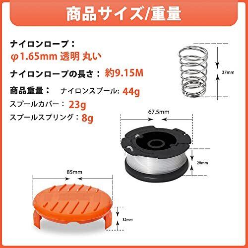【高品質】この草刈機のストリング及びスプールカバーは高品質のスプールと耐久性のあるナイロン糸で作られておるから、長い使用寿命です。 【自動巻】プロの芝刈りは自動巻きで、手巻きよりは安全で時間の節約にもなります。 【設置簡単】工具なしで簡単に交換可能で、使用にはとても便利です。 【優れるパフォーマンス】高速な切削で素速いから、草刈機が作業する際詰まりなどがなくて、草刈機に対しての損傷も最低限に軽減させ、使用の信頼性が向上します。 【適用性】BLACK + DECKER AF100ストリングトリマーと交換性があります。