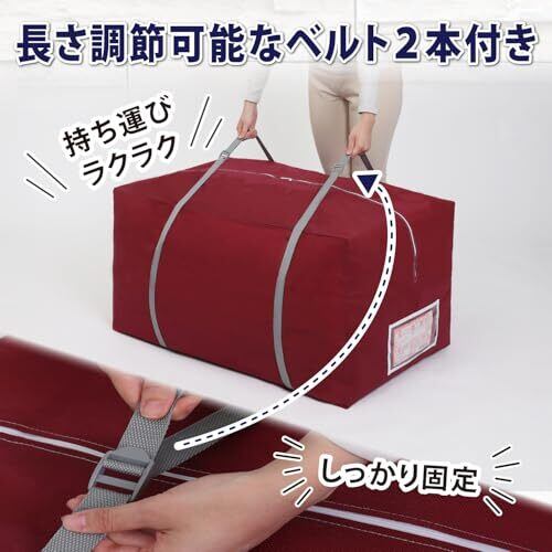 【商品仕様】:サイズ/約幅95×奥行60×高さ50cm、カラー/えんじ色、内容/袋1枚・ベルト2本、収納目安/布団:約2~3枚、材質/ポリプロピレン 【通気性に優れた不織布製】:通気性の良い不織布でかさばる布団を湿気やホコリから守りまとめてスッキリ収納。 【布団の出し入れスムーズ】:ダブルスライダーのロングファスナーで大きく開くので、布団の出し入れがスムーズ。 【運搬の際に便利なベルト】:持ち運びの際に便利な長さ調節可能なベルト2本付きで、ヒモを用意する手間が省ける。 【送り状入れポケット付き】:サイドに透明のポケット付きで、中身のメモや引っ越しなどの際の送り状を入れられて便利。