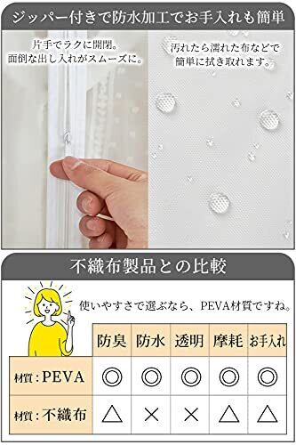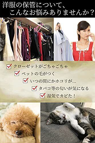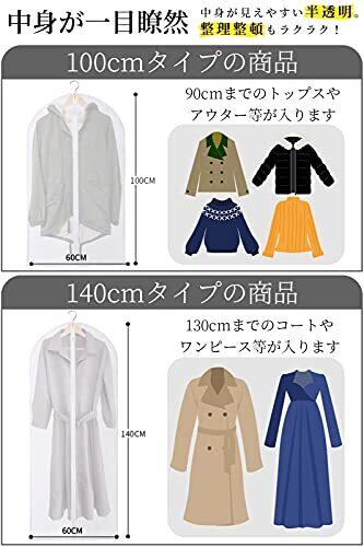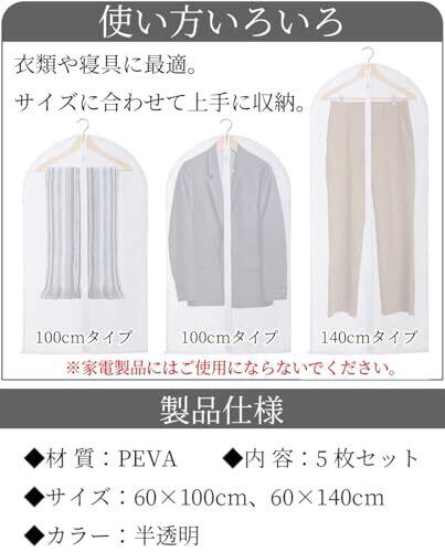 【■優れた防塵性能のPEVA材質】 ホコリや汚れをしっかり防ぐ防塵素材。ペットの毛や部屋のほこりから服を守ります。不織布カバーよりも防塵性能が高く、大切な衣類をきれいに保管できます。汚れの侵入を最小限に食い止めるため、ハンガー穴は小さめにし、底部分を縫い合わせました。 【■防水性が抜群】 水に強いPEVA材質。湿気から服を守り、カビ・ニオイ・虫を防ぎます。汚れたら水拭き可能。タバコのニオイ・生活臭・虫食いから衣類を守って長持ちさせます。 【■見える半透明で整理整頓◎】 中身が分かる半透明で、衣類の整理に便利です。家族が多いと季節毎の服がごちゃごちゃになりがちですが、パッと見てすぐに整理ができます。ケースに入れたままで衣類の仕分けやメンテナンスがしやすく、ウォークインクローゼットがすっきり綺麗に。 【■やわらかくたためる素材】 丈夫でやわらかく、コンパクトにたためます。小さく折りたたんで収納でき、旅行や保管に便利。大きく開いて使いやすいジッパー式です。 【■商品仕様】 ●材質:PEVA●サイズ:60×100cm/60×140cm●色:半透明●サイズ:約幅60×長さ100cm●内容:5枚セット