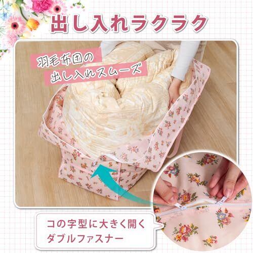 【商品仕様】:サイズ/約幅70×奥行30×高さ50cm、カラー/薄ピンク、柄/小花柄、内容/1枚、収納目安/シングルサイズもしくはダブルサイズの羽毛布団1枚、材質/ポリプロピレン・ポリエチレン 【通気性の良い不織布製の羽毛布団収納袋】:オフシーズンの羽毛布団をほこりから守る、通気性の良い不織布製の収納袋。 【持ち手が付いていて持ち運びがしやすい】:持ち手付きで、クリーニングの際や引っ越しの際などにも持ち運びしやすい。 【立てて収納できる・中身が見える透明窓】:マチ幅が広くクローゼットなどに立てて収納でき、中身が見える透明窓付き。 【布団の出し入れスムーズ・折りたためる】:ダブルファスナーでコの字にガバッと開くので、布団の出し入れがスムーズ。使わないときは折りたためてスリムに。レトロかわいい薄ピンク色×小花柄。
