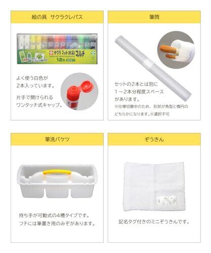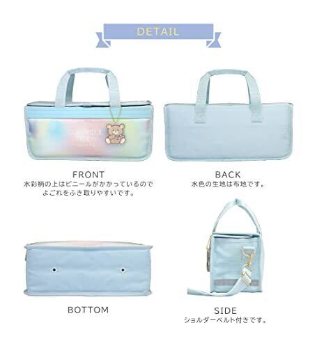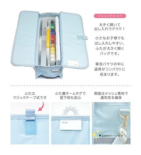 【洋服についた絵の具が落としやすいマット水彩マルチ】★トーヨー教材オリジナル 水彩絵の具の使い方の手引きをお付けします!小学校の授業で使える小学生向け絵の具セットです。 水色と水彩柄が可愛いバッグです。正面はビニール、パステルブルー部分は布地です。かわいいくまさんのキーホルダー付き! 大きく開くので、出し入れラクラク!道具はバケツの中にコンパクトに収まります。 名札が内側に付いているので登下校も安心。手さげ・ショルダーの両方で使える2WAYタイプです。通気性のあるメッシュ素材を使用しているので、カビを防いで清潔に使えます。 マット水彩マルチは、マット水彩に比べて洋服についた絵の具が落ちやすい絵の具です。【バッグサイズ】約縦14cm×横32cm×奥行12cm