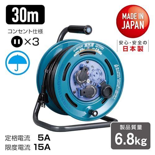 電線仕様(種別・太さ×心数):VCT 2.0㎟×2心、製品定格:125V・5A コンセント定格:2P・15A・125V、コンセント数:2P×3個 質量:6.8kg、コード長さ:30m、サイズ:H353×W275×D219mm その他特長:一体モールド成形(コンセント部)、コンセント防雨キャップ、パイロットランプ内蔵 【特徴】コンセント盤配電部を一体モールド成形。画期的な防雨構造で水の浸入を防ぎます。カチッと定位置に決まるコンセント防雨キャップは、未使用時は押し込んで閉めることでコンセント内部へ水やホコリの浸入を防ぎます。