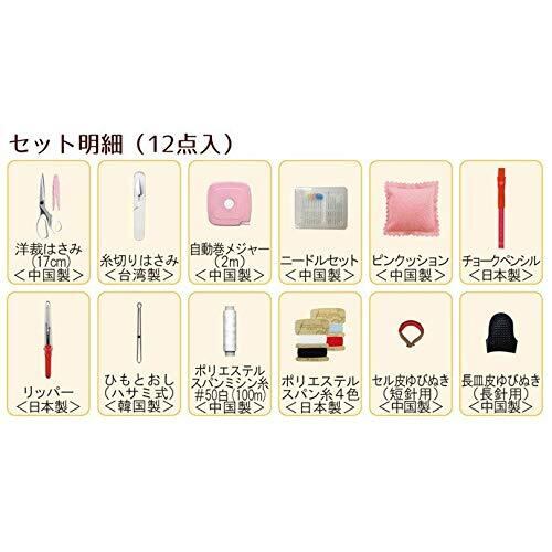 原産国:中国(ケース) サイズ:ケース/225×160×55mm(ハンドル含まず)・パッケージ/200×275×70mm 材質:ポリエステル100% 内容量:洋裁はさみ(17cm)、糸切りはさみ、自動巻メジャー(2m)、ニードルセット、ピンクッション、チョークペンシル、リッパー、ひも通し(ハサミ式)、ポリエステルスパンミシン糸#50白(100m)、ポリエステルスパン糸4色、セル皮ゆびぬき(短針用)、長皿皮ゆびぬき(長針用) ※中ケースは入っておりません。