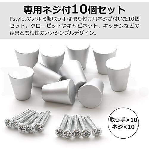 【ネジ付き10個セット】 Pstyle.のアルミ製取っ手は、取り付け用ネジが付属します。クローゼットやキャビネット、キッチンなどの家具とも相性がいいシンプルなデザインです。 【5色のバリエーション】 金具は5色からお選びいただけます。洗面所やシンプルな家具、アンティークな雰囲気の食器棚など、幅広く対応できます。シーンに合わせてお選びください。 【おしゃれな家具にランクアップ】 シンプルで無駄な装飾を省いたデザインのつまみなので、どんな家具とも相性はいいと思います。取ってのカラーによって家具の雰囲気も変わってきますので、模様替えとしても楽しめます。専用のネジも付属しているため、ドライバーさえあれば、すぐにでも取手の交換は可能です。 【対応する厚さ】 付属のネジを使用する場合、取っ手のネジ穴の深さは7mmです。15mm以下20mm以上の厚さのひきだしや開き扉の場合は別途ネジをご用意ください。*交換先のサイズをあらかじめご確認ください。 【仕様】 つまみ:直径2cm。 高さ:2.3cm。 取り付け部分:直径1.2cm。 材質:アルミニウム合金。 重量:約13g。
