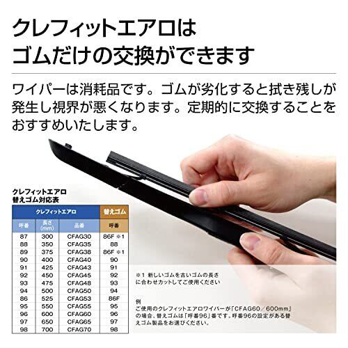 クレフィットエアロ(グラファイトコーティングゴム)500mm 「クレフィットエアロ」/替えゴム交換可能。替えゴム交換の際にはPIAAの替えゴムをご使用ください。(ご購入前に適用表をご確認ください) 品番:CFAG50/呼番:94 グラファイト粒子をコーティング。摩擦抵抗を軽減し、滑らかな払拭効果。「エアスルー構造」+「エアロシェイプ」にて高速走行時のワイパーの浮き上がりを抑制。 ※[注意] ワイパー及び替えゴムをご購入の際は、必ず適用表をご確認の上、適切な製品をお選びください。
