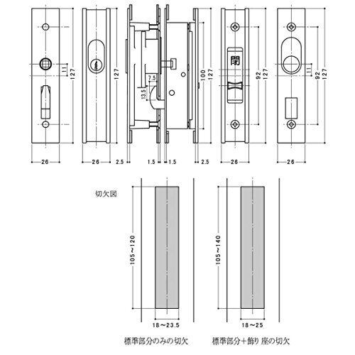 色:ブロンズ 引違戸の取り替えとして最適 付属品の飾り座の使用で幅広い切欠、戸厚に対応可能 適応扉厚:25.5mm~31mm 適応切欠:W18~25、H105~140mm キー本数:3本 サイズ:127×26×65mm 重量:415g