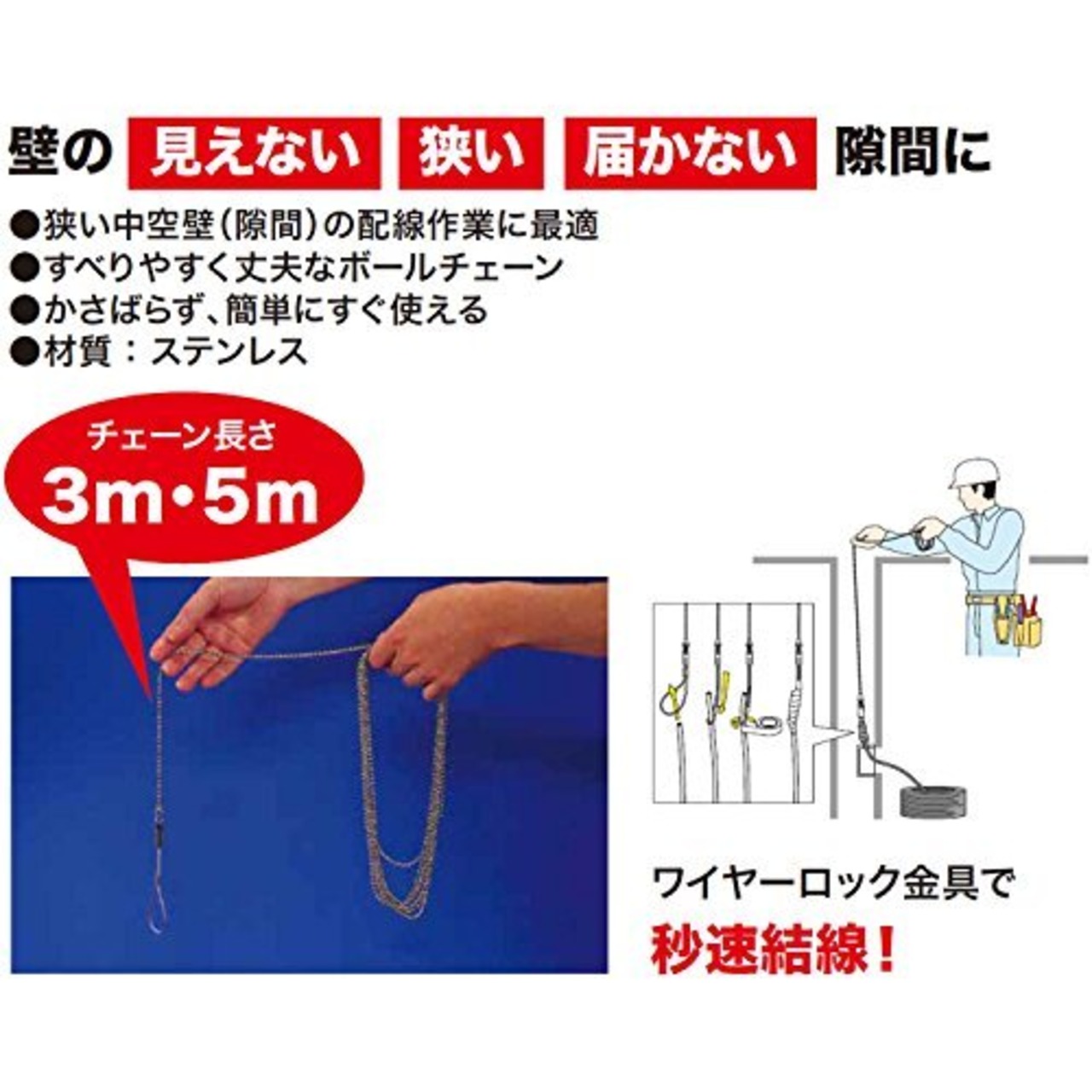 壁の「見えない・狭い・届かない」隙間に 狭い中空壁(隙間)の配線作業に最適 すべりやすく丈夫なボールチェーン かさばらず、簡単にすぐ使える 材質:ステンレス ワイヤーロック金具で秒速結線! 【仕様】チェーン長さ:5m・チェーン径:φ3.5mm・質量:95g・チェーン引張荷重:15kgf・全体破断荷重:10kgf