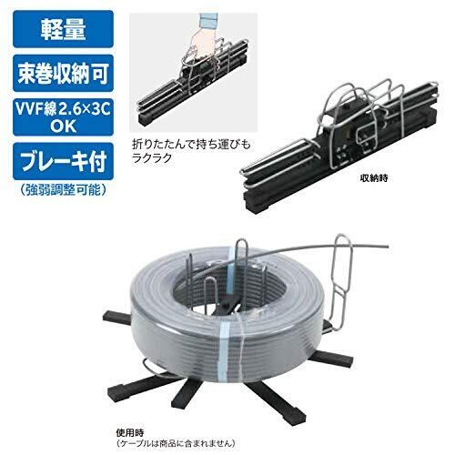 特徴1:折りたたんでコンパクトに収納、持ち運びもラクラク 特徴2:ブレーキは調整ノブで調整可能 特徴3:シュリンク・ラップ包装のまま繰出しできる 収納可能電線類:VVF(VA線):φ2.6×3芯(100m)、IV:8mm2(300m)、VCTF :2mm2(100m)※電線メーカーにより適応しない場合もあります サイズ:515×φ490(回転円径)×230mm(展開時)、530×60×170mm(収納時)