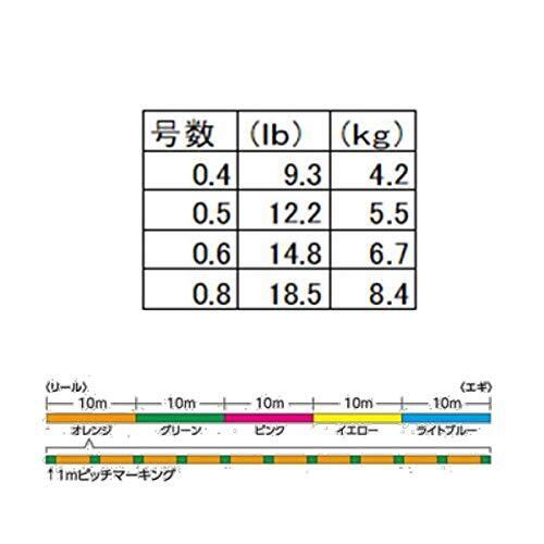 号数:0.4 最大強力lb(kg):9.3lb (4.2kg) 長さ(m):150 カラー:10m×5カラー (オレンジ、グリーン、ピンク、イエロー、ライトブルー)