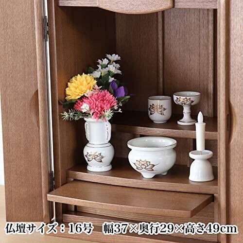 白磁金蓮陶器5点(香炉・火立て・花立て・茶器・仏器)のお得なセットです。さらに香炉灰付きです。※火立てのみ蓮の模様がありません。 このセットは上置き仏壇やミニ仏壇に良く合います。どの宗派でもお使い頂けます。白色の仏具がお仏壇を明るくします。 【サイズ】花立て:径5.4cm×高さ10.5cm、香炉:径9.3cm×高さ6.5cm、火立て:径4.3cm×高さ5cm、茶器:径4.5cm×高さ5cm、仏器:径5.4cm×高さ6cm お勧めのお仏壇サイズは16~20号のお仏壇です。 ※実際のサイズと若干異なる場合がございます。 ※火立てのみ蓮の模様がありません。