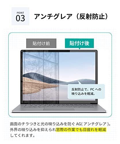 【対象機種】 Surface laptop2 , Surface laptop3 , Surface laptop4 (13.5inch) 【ブルーライトカット率33%】 見やすさとブルーライトカット性能のバランスに優れたPETフィルムです。 ブルーライトカットフィルムでありがちな、フィルム自体の着色を抑えつつ、高い透過性でディスプレイ本来の見やすさが重視されたフィルムです。 【抗菌特性】 黄色ブドウ球菌が24時間で99.9%消滅するといった抗菌コートが施されています。ついつい触ってしまいがちなノートパソコンの画面をいつも清潔に保ちます。 【反射防止】 画面のチラつきと光の映り込みを防ぐAG(アンチグレア)コーティングを施しています。 外界の映り込みを抑えられ窓際の作業でも目疲れ軽減してくれます。 【フッ素配合】 フッ素コーティングで表面はサラサラ、汚れが付きにくく気になる指紋も簡単に拭き取ることができます。【自己吸着タイプ】粘着面には特殊シリコン樹脂を使用。自然にエアが抜けて液晶画面に気泡が残りにくい(自己吸着・気泡軽減)特性を兼ね備えています。