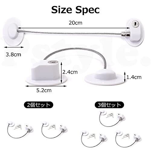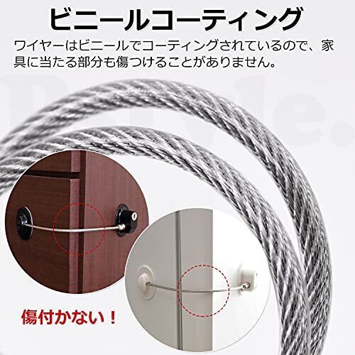 【ドア・窓などのロックに】 窓やドアに取り付けることで、窓が開きすぎないように制限したり、開き戸が開かないようにすることが簡単にできます。*防犯効果があるものではございません。 【取り付け取り扱いが簡単】 穴あけや特別な工具は一切不要です。両面テープを剥がして設置面に貼り付けるだけ。鍵を使ってワイヤーの脱着を行うため、赤ちゃんや子供、ペットがとびらを勝手に開けてしまう事はありません。*使用する鍵はすべて同じものです。 【ビニールコーティング】 ワイヤーはビニール素材でコーティングされているため、引き出しや開き戸など、家具が傷つきにくくなっております。 【様々なシーンで活躍】 冷蔵庫やタンスなど、貼り付けるだけで簡単にロックすることができます。ベビーガードとして、犬や猫の脱走防止として、活躍できるシーンは多いでしょう。 【仕様】 ワイヤーの長さ:約20cm。 バリエーション:2個セット、3個セット。