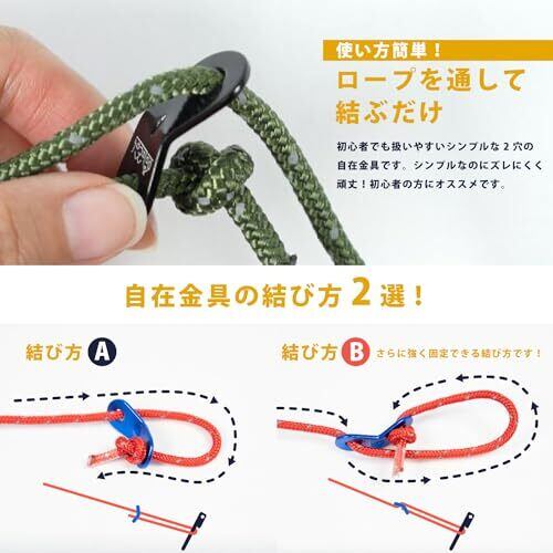 <スペック>サイズ:縦4cm×横1.6cm×穴径0.6cm 重量:2.8g 素材:アルミニウム <軽量アルミニウム>高品質な軽量アルミ合金を採用!軽量アルミニウムは耐久性に優れており変形やサビにも強く、且つ重量も僅か2.8gと軽く丈夫で軽いを両方兼ね備えています。 <ワイヤーリング付き>20個の自在金具を一つにまとめる事が出来るワイヤーリング付き!持ち運びに便利でキャンプ場などの野外で紛失も防げます! <5mmまで対応>DaLaCaの自在金具は5mmのロープまで通す事が出来る様に設計しています。細いロープから太いロープまで様々なサイズのロープにお使いいただけますので、テントやタープのロープに最適です! <バリ取り済み>面倒なバリ取り作業済み!バリによるロープの擦れなどが少ないのでロープの劣化を抑え、無駄な摩耗を起こしません!ロープを大事に長くお使いいただけます。