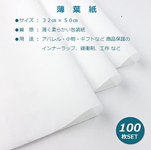 銘柄:薄葉紙 白 ※日本製 紙厚:約0.02㎜(坪量:14g/㎡) サイズ:32㎝×50㎝ 数量:100枚 用途:アパレル・小物・ギフトなど商品保護のインナーラップ包装、緩衝剤、工作