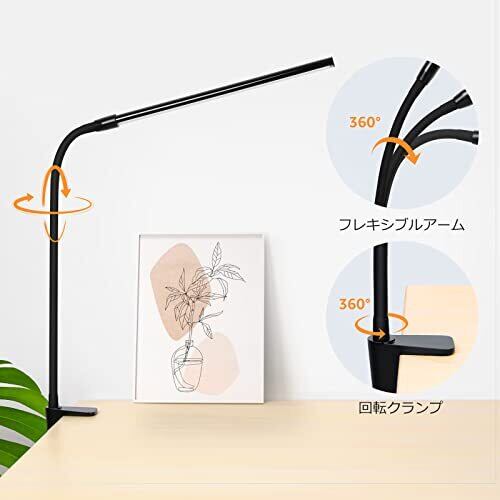 【3種の色温度・明るさ10段階】電球色、白色、昼光色の3段階調色と10段階の調光機能が搭載され、使用シーンに合わせてボタンでお好みの色と明るさが変えられます。メモリー機能により、次回使用時に最後のモードと明るさが維持されます。明るさは最大460ルーメンとなり、他の製品より明るくて、作業や勉強などに最適です! 【フレキシブルアーム・広い照射面積】自由に動かせるアームと回転クランプを採用しながら、グランプライトを360度広範囲で自由自在に動かせます。任意の角度に調整して、デスク上を照らすLEDライトの光を最適化します。勉強や読書、ペインティングなどの細かい作業にも安心! 【しっかり挟める・省スペース】組み立ては非常に簡単で、工具は一切必要ありません。クランプを使うことで、厚さ5cmまでのテーブルにLEDデスクライトを簡単にかつしっかり固定することができます。クランプのデザインにより、デスクのスペースを大幅に節約できます。 【目に優しい・高演色性・多重影なし】平面発光デザインにより、多重影やムラといった目に負担をかける要素を軽減します。自然光に近いRa80以上の高演色性で、柔らかく広範囲に光が広がります。長時間の学習や作業でも目が疲れにくく、子供から大人まで安心して使える目に優しいデスクライトです。 【USB給電・省エネ】デスクライトはUSB-Aポートに電源アダプタを接続するだけですぐに点灯します。高輝度LEDチップを採用しており、消費電力は僅か5Wです。LEDライト自体の発熱も抑えられ、子供でも安心してご利用いただけます。 【適格請求書対応・パッケージ内容】本商品はインボイス制度に対応しており、適格請求書の発行対象となります。購入履歴からの適格請求書発行:対応可能です。LeproクランプライトはPSE認証済みで、安心してご利用いただけます。パッケージ内容:LEDクランプライト(ブラック)*1、日本語取扱説明書*1。 【ご注意】●本製品には電源アダプタが付属しておりませんので、5V/1AのUSB-A電源アダプタをご用意ください。他の規格のアダプタはご使用にならないようご注意ください。●製品が正常に動作しない場合、まずはアダプターの問題を確認する必要があります。他のアダプターに交換していただき、再度お試しください。