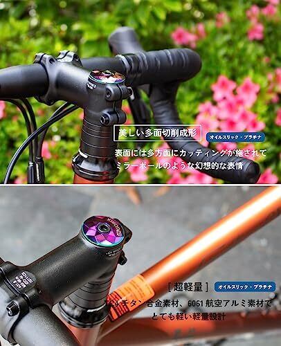 【商品内容】:キャップ本体×1、ゴムスペーサー×2【材質】:アルミ合金【取付可能ステム径】:MAXφ31.8mm(又φ26.0mm、φ25.4mm用のゴムスペーサーが付属しております)【重量】:約28g【カラー】:オイルスリック [超軽量]TC4チタン合金素材、6061航空アルミ素材でとても軽い軽量設計[美しい多面切削成形]表面には多方面にカッティングが施されてミラーボールのような幻想的な表情 惹きつけるオイルスリックは自転車のカスタマイズに最適です。[簡単装着]ネジを緩めてヘッドのキャップを変更するだけのとても簡単な作業です。(※キャップはしっかりと締めて下さい) ハンドル周りの中心になるヘッドキャップをおしゃれなオイルスリックカラーに。表面は多方面にカッティングを施してありとても綺麗な仕上がりとなっています。光や角度によって色が変わり飽きない美しいヘッドキャップです。 とても軽量で幅広い自転車でお使い頂けます。ロードバイク、マウンテンバイク、クロスバイクなど。