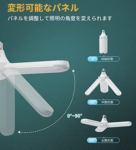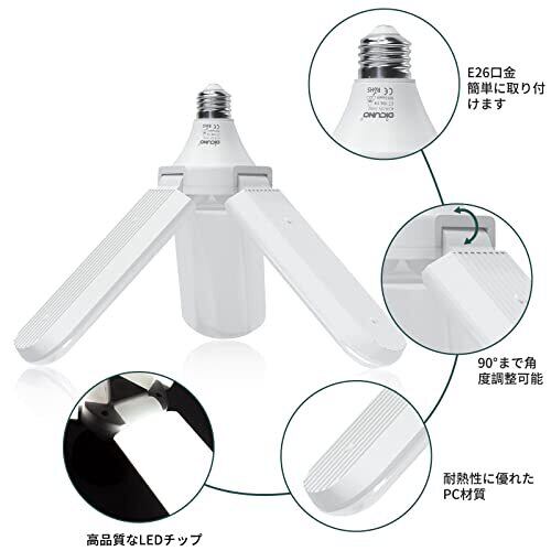 【商品情報】口金:E26 定格電圧:100-220V 色温度:5000K(昼白色) 配光:広角180度 演色性:Ra85+ 全光束(明るさ):4000lm 消費電力:40W 【優れた性能】高品質なLED チップを使用して、40Wの消費電力で4000lmの明るさが実現でき、電気代を約90%節約できるし、環境と家計に優しくてエコな省エネ照明です。また、PC材質なので、ガラスと同程度に光を透過しますが、光の眩しさがなく、自己消火性・耐衝撃性・耐熱性に優れています。 【超高輝度】4000lmの超高輝度で、明るくて美しい光が演出できます。光色が正午の太陽光と同じような5000Kなので、照射された物が一番自然に見えます。寝室、リビングルーム、ガレージ、地下室、玄関、倉庫、作業場などに最適です。 【自由自在に調整】3灯式一体型のLED 電球なので、十分な明るさが確保される同時に、取り付けと収納が簡単にできます。最大180°の発光角度で、 3つのLEDパネルを上90°まで、角度調整できますので。必要に応じて、光の照射範囲が自由に変換されます。 【一年保証】ご購入日より一年間の保証を提供いたします。万が一商品に不良またはご不明なところなどがございましたら、お気軽に[email protected]までご連絡ください。