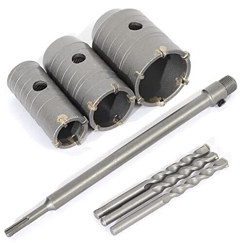 【3サイズコンクリートドリルセット】直径30~50mm お得な3サイズ(30mm 40mm 50mm)、35cmロングシャフト、センタードリル付き。 【使用頻度の高い3サイズセット & 350mmロングシャフト】使用頻度の高い3サイズをセットにしました。 幅広いサイズのドリル・シャフト・位置決め用のセンタードリルが セットになっています。 穴あけ工事等の作業現場で、予定していたサイズを変更することに なっても柔軟に対応しやすい実用性の高いドリルセットです。350mmロングシャフト付きで狭い場所での作業に最適◎ 【高品質合金を使用】切削加工、研削加工に相性の良いS45C素材。 S45Cは炭素含有量が0.45%と、炭素含有量が0.2%ほどの 軟鋼に比べて硬く高い強度を持っています。 硬度や強度に加え、熱処理が必要とされる場面でも S45Cが採用されています。 【業者様ご用達!】陶器瓦、いぶし瓦などの粘土瓦、セメント瓦、洋瓦への穴あけに。 モルタル、ブロック、レンガ、ALC、日本壁、ラス壁などの穴あけに。 冷暖房、電気、ガス、水道、電話工事等における鉄筋コンクリートの穴あけに。 【SDSplusシャンク】シャンクはSDSプラスを採用。