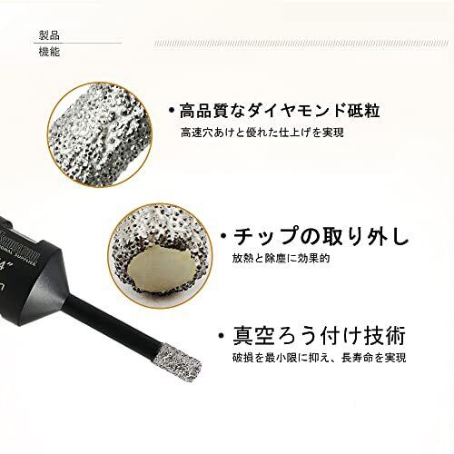 1.3個直径(mm):6,全長(mm):60, ダイヤモンド高い 10MM,M10 軸径,ドリルビットガイド無しで位置決めが可能,適合機種: アングルグラインダー ; 2.簡単に、高速に、穴あけができます,ディスクグラインダを使用して床タイルなどの硬質タイルでも 3.コア内のワックスが穿孔熱で徐々に先端に出て冷却していくので水が不要 4.タイル表面の欠けが少なく仕上りがキレイ 5.タイルのキワの穴あけも簡単,磁器タイル他すべてのタイル,花崗岩、大理石、セラミックの乾式/湿式ドリルの穿孔