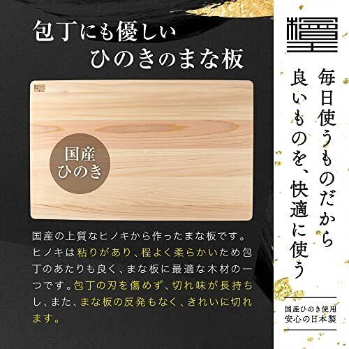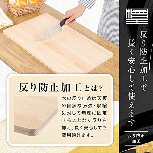 【サイズ】 約48cm×30cm×厚さ1.3cm 【材質】 本体:ひのき 【 日本製 】【 木製 】 【特長】 ・シンクに渡せる大きなサイズでも、軽くて使いやすい薄型タイプのひのきまな板。・反りを抑える「反り防止加工」を施しています。 【お手入れ】 ・ご使用後は早めに汚れを洗い流し、水気をしっかり拭き取りよく乾かしてから保管してください。濡れたまま置いておくとカビの原因となります。 ・洗いはじめにお湯をかけると、まな板に残っている魚や肉のタンパク質が固まり、臭いが残りやすくなります。 ・洗う時は食器用洗剤を付けた柔らかいスポンジか天然素材のたわしで洗ってください。金属たわしなどを使うと傷がつくおそれがあります。 ・漂白剤のご使用により、木の成分と反応して黒や褐色のシミができることがあります。 台所用漂白剤は必ず説明書どおり希釈してご使用ください。目立たないところで試してから使用してください。洗浄後は成分が残らいようにしっかりとすすいでください。なお、泡タイプの漂白剤のご使用はおやめください。 【ご使用上の注意】 ・用途外のご使用はおやめください。 ・ご使用前に軽く水で濡らすと、食品の色や臭いがつきにくくなります。 ・まな板を保管する時は、まな板の水気をしっかりと拭き取ってください。 ・直射日光や食器洗い乾燥機など、高温での乾燥はおやめください。割れや反りの原因となります。 ・ひのきはヤニ成分を多く含んでおり、密閉された状態や暑くなると表面に出てきてシミができたりベタべタすることがあります。体に害はありません。アルコールで拭きとってください。