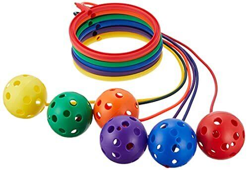 原産国:台湾 6ヶ1組(赤、青、黄、緑、紫、オレンジ) 主材:ポリプロピレン 全長80cm、リング内径14cm、ボール直径6.5cm 重さ80g/ヶ