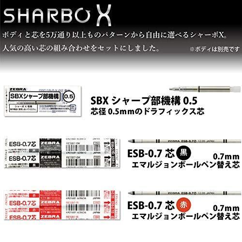 【シャーボX】ボディ、シャープメカやボールペン替芯を自由に選んでMyオリジナルの1本を作ることができる 【セット内容】ESB-0.7芯×2色(黒、赤)、SBXシャープ部機構0.5×1本入り 【シャーボX適合替芯】4C-0.7芯/1.0芯、JSB-0.4芯/0.5芯、ESB-0.5芯/0.7芯 【シャーボX適合シャープ機構】SBXシャープ部機構0.3/0.5/0.7 【ESB-0.5/0.7芯のインク種類】黒、赤、青、緑