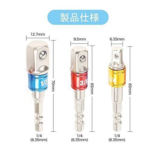 【堅牢で耐久性】高品質のクロムバナジウム鋼製、高硬度、高耐摩耗性。表面処理:クロムメッキ。※(大量購入はカスタマーサービスに連絡して価格をお問い合わせください) 【パッケージ内容】3本組六角軸用ソケットアダプター 。軸径:6.35mm。3差込角:6.35mm(1/4″)、9.5mm(3/8″)、12.7mm(1/2″)。 【使いやすい】6.35mmの六角シャンクはあらゆるチャックに対応し、素早く交換でき、適用範囲が広がります。頭部のバネ付きボールベアリングはソケットをしっかりと保持します、脱落しにくいです。インパクトドライバーなどに簡単に装着できるソケットアダプターです。 【多機能】スクリュードライバー、電動スクリュードライバー、電動ドリル、手動スクリュードライバーなどの六角ツールなど。不可欠な変換アダプター 工具。ソケットレンチと組み合わせて使用できます。DIY愛好家、車の修理などの分野の問題を解決します。 【用途】ボルト・ナットの締め付け、取り外し作業に。インパクトドライバーなどに簡単に装着できるソケットアダプターです。各サイズ六角ボルト・ナット・ネジの着脱。家庭用DIY、木工、自動車部品、プロの機械修理などに。