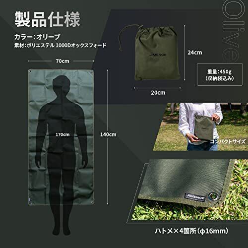 JIMENCE(ジーメンス) レジャーシート 1人 2人用 厚手 コンパクト 70×140cm 防水 両面撥水 収納袋付き (オリーブ)