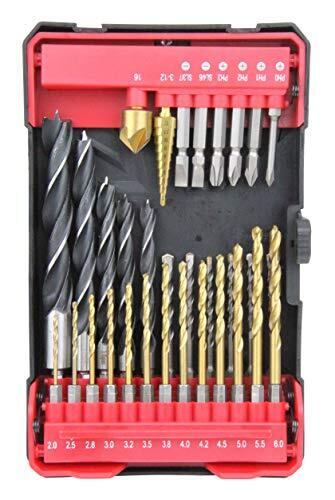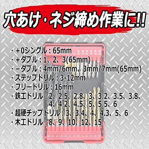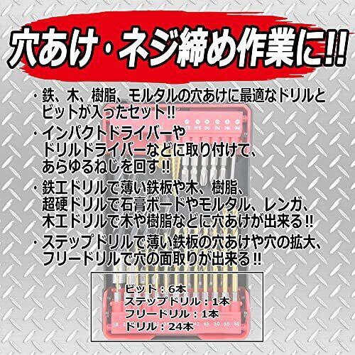 用途:穴空け・ネジ締め作業 仕様1:ドリルドライバーやインパクトドライバーなどに取り付けて使用 仕様2:鉄工ドリルで薄い鉄板や木、樹脂、木工ドリルで木や樹脂、超硬ドリルで石膏ボードやモルタル、レンガなどに穴あけが可能 仕様3:ステップドリルで薄い鉄板の穴あけや穴の拡大、フリードリルで穴の面取りができる 入組総数:32点(ビット6本、ステップドリル1本、フリードリル1本、ドリル24本)