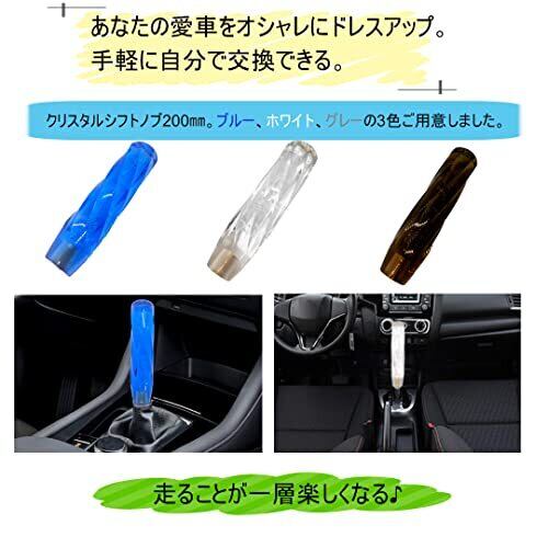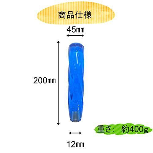 こちらの商品はクリスタルシフトノブ気泡入り200㎜です。愛車をドレスアップするのに最適なシフトノブです。 透明感のある色鮮やかなアクリル水晶で見た目がスタイリッシュなシフトノブです。ブルー、ホワイト、グレーの3色をご用意しました。愛車簡単にドレスアップできます。カーマニア、ドライビングが好きな方にもってこいの一品。 長さが200㎜、グリップ幅が約5㎝と持ちやすい設計になっておりギアシフト時もスムーズに行えます。また全体がツイスト状になっているので滑ったりせず手になじみます。 付属の口径交換アダプターが他にも2種類付属しており、M12×1.25、M10×1.25、M8×1.25に対応。これにより様々な車種にご使用できます。 【商品仕様】 商品内容:クリスタルシフトノブ1本、付属の口径交換アダプターM10×1.25、M8×1.25各1個ずつ(初期状態でM12×1.25が装着してあります。)カラー:ブルー、ホワイト、グレー。サイズ:長さ20cm、幅4.5㎝。モニターなど環境により画像と若干見え方が違う場合がございます。
