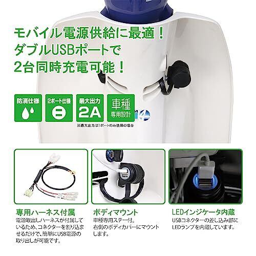 適合車種【※国内仕様車のみ適合】スーパーカブ50スタンダード:AA04全車種 | スーパーカブ110:JA07全車種 | スーパーカブ110スタンダード:JA10全車種 USBポート:1,000mA×2個 DC5V 最大出力:2,000mA(1ポートのみ使用の場合) 防滴仕様 LED内蔵(ブルー) モバイル電源供給に最適な、2ポートタイプのUSB電源に専用ハーネスを付属した車種専用タイプです