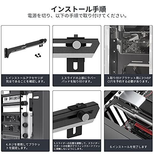 高品質な材質:黒い厚み金属材料と導光板を採用。本体は金属に覆われている、熱による変形も気にしなくてす、何十年も耐えることができます。一度の購入で長期間使用できます。全陽極プロセスは表面の質の耐久性を維持し、色を長い間不変に保つことができます。 安定性:GPUを左右水平移動/上下スライドスタンドで固定します。グラフィックボードの垂れ下がり防止の効果もあったのを取り付ける。支えは高さと左右の位置調整できるのである程度融通が利くです、さまざまなビデオカードの重量とサイズに合わせて調整可能。 汎用性:様々なマザーボードとケースに適用、ほとんどのGPU、マザーボードおよびATXシャーシと互換可能。 取付方法:1.上部にゴムパッドを貼り付けます。 2.PCI穴にネジ3本を入れてホルダーを固定します。 3.左右水平移動/上下スライドスタンドでGPUを固定します。 4.ホルダーの組立状態を確認し、しっかりと固定します。 寸法:L276mm×W30mm×H50mm。付属品:サポートステイ x 1・サポートゴム一式 x 1・スロット固定用ネジ x 4。