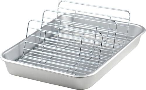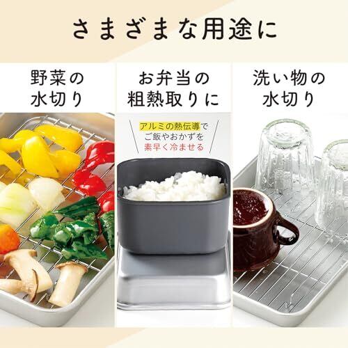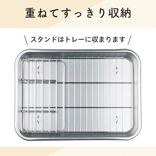 サイズ(約):31.7×23×4.1cm、組み立て時/31.7×23×9.3cm、板厚/0.75mm 本体重量(約):510g 素材・材質:本体/アルミニウム、本体加工/アルマイト加工、アミ/鉄・クロームメッキ 生産国:日本 立てるアミ:3枚
