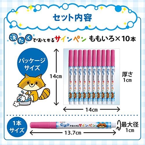【特長1】衣服についても洗たくで落とせる(※生地・インキの色によって落としにくいものもある) 【特長2】食用染料など安全性に配慮したインキ使用 【特長3】万が一お子様がキャップを飲み込んでしまった場合を考え、通気性キャップ採用 【単品サイズ】キャップ付137×最大径11.1mm/重量8g 【入数】10本入り
