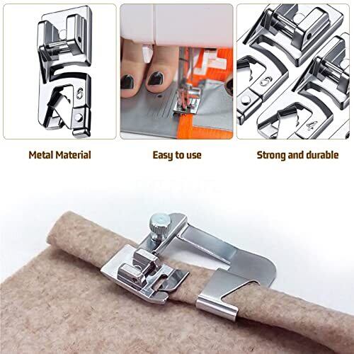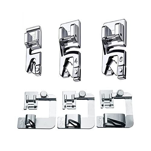 【三つ巻き押さえ】家庭用多機能ミシン押さえです。布の端を巻き込みながら三つ折に縫い上げます。 【高品質の材料】合金材料で作られて安心して使用できます。頑丈で耐久性があります。 【サイズ】6個セット 1、仕上がりサイズ:3mm 押さえのサイズ:36*6*6mm 2、仕上がりサイズ:4mm 押えのサイズ:36*14*6mm 3、仕上がりサイズ 6mm 押えのサイズ:36*15*7mm 4、仕上がりサイズ 13mm 押えのサイズ:48mm*43mm 5、仕上がりサイズ 19mm 押えのサイズ:48mm*43mm 6、仕上がりサイズ 25mm 押えのサイズ:48mm*43mm 【使い方法】1.薄い生地に扁平なロールエッジを作るのに適しています。2.生地を裏返しにして、押さえ足の下に置く。3.押え足と針を持ち上げます。4.布を前後に引っ張り、押さえ先端の巻き溝を通過させます。 5.布の縁が針の下にあることを確認し、押さえレバーを下ろしてください。6.2-3ステッチをゆっくりと縫製し、布が押さえ先端の巻き溝に送り込まれることを確します。7.縁取りが完成するまで縫製を続けます。 【幅広い用途】薄い生地のステッチに適用でき、美しく実用的です。実用的なデザイン、インストールと使用が簡単。