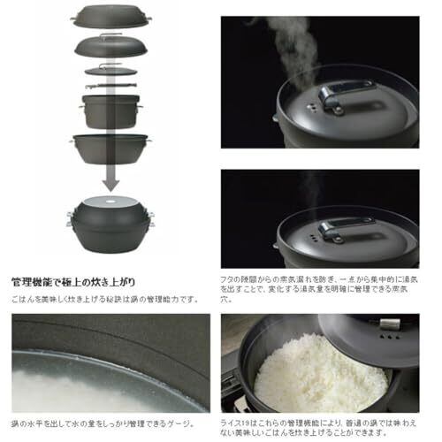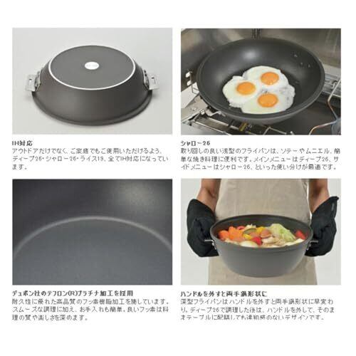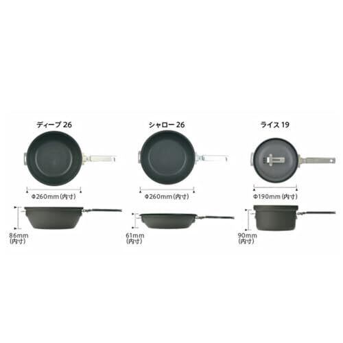 材質:本体/アルミニウム・フッ素樹脂加工・セラミック焼付塗装 本体底部/鉄・アルミニウム容射 フタ/アルミニウム・セラミック焼付塗装 ツマミ・ブラケット・ハンドル/ステンレス サイズ:ディープ26/内寸径260×86mm・満水容量4.6L シャロー26/内寸径260×61mm・満水容量2.8L ライス19/内寸径190×90mm・満水容量3.3L 収納サイズ:径280×165mm、重量:3,970g(ケース含む)