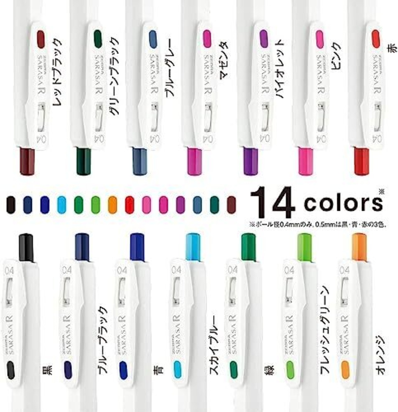 【サラサR】濃く書けるサラサ 【替芯インク種類】0.4/黒、青、赤、オレンジ 0.5/黒、青、赤 【特長】濃く書けてノートがきれいに見やすく仕上がる 【インク】水性染料 【本体サイズ】最大軸径11×141mm/重量10.9g