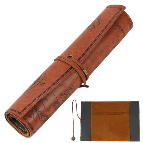 【高品質PUレザー製】重厚感たっぷりのPUレザー製で手触りが良く柔軟性抜群!ペンケースとしてはもちろんのこと、小物入れやちょっとしたポーチにも!中のポケットが3つに分かれているので、種類別の収納も可能! 【ロール型タイプ】くるっと巻いて紐で留めるタイプなので、安定感があり持ち運びに便利!落下防止の蓋も付いているので、中身が滑り落ちません! 【レトロなデザイン】宝の地図のようなレトロ感たっぷりのおしゃれなデザインで、持っているだけでテンションの上がるアイテムです。閉じていてもかわいいので、インテリアとしてそのまま飾るのもおすすめです! 【贈り物にもおすすめ!】雰囲気の違う2色の展開からお好みに合わせて選べます!学校やオフィス、自宅での使用など様々なシーンに大活躍なので、大切な方へのプレゼントにもぴったり! 【商品特徴】①高耐久で丈夫な素材:耐久性も抜群のPUレザーで長く使用可能/②アクセサリー付き:可愛いアクセサリー付きのお洒落な紐/③幅広い用途に大活躍:筆記用具やメイク用品・工具入れとしても!/④プレゼントにも!:お誕生日や入学祝いなどの贈り物に! 【商品詳細】重量:約65g素材:PUレザー/サイズ:31 x 20.5 cm/セット:1個/
