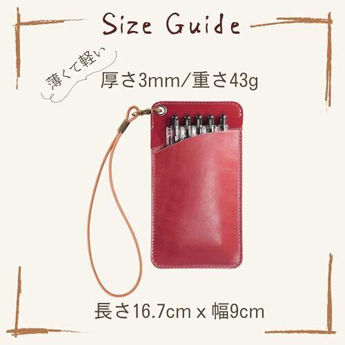 【姫路レザーのヌメ革使用日本製ペンケース】革は日本有数の皮革産地・姫路で加工された姫路レザー。 植物由来のタンニンでなめした自然な風合いのヌメ革です。 東京・立石の革工房でペンケースに仕立てました。裁断面のコバ処理にもこだわり、塗り仕上げを施しています。 【シンプル&スリムデザイン】シンプルでスリムなデザインだから、カバンやポケットに入れてもかさばりません。細めのペンなら4、5本程度がすっきりと収納できます。 【取り出しやすく、飛び出しにくい】ペンをさっと取り出しやすいファスナーレスですが、ワンタッチではめられるかぶせが付いています。カバンなどに入れてもペンが飛び出しにくい、スマートデザインです。 【サイズ】167×90×4mm 【重さ】43g 【ご注意】ペンのフックをペンケース本体に引っかけて使用する場合、または頭の部分の太いペンを入れた場合は、ペンケースのかぶせをはめられないことがございます。