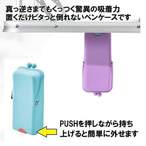 【特徴1】タテにもヨコにもスマホが置けるシリコンタイプの立つペンケース 【特徴2】大きく開くがま口タイプで大容量 【仕様】置くだけで机に吸着してピタッと倒れない特殊構造 【本体サイズ】h207×w97×d51mm 【材質】シリコーンゴム、鉄