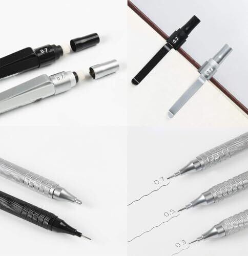 0.3mm&0.5mm&0.7mm シャープペンシル: プッシュボタン キャップの下に消しゴムが内蔵されており、2b 芯を詰め替えて書くことができ、書き物や描画に最適です 金属製クリップ、上品なファッション、持ち運びに非常に便利です 金属製シャープペンシル: 特殊な金属素材、金属糸グリップ、滑り止め、錆びません 鉛筆のサイズ: 14.5 x 0.9 cm、金属ボックスのサイズ: 18 x 3.7x 2 cm パッケージの内容: プロペラ ペンシル x 1、2b 芯チューブ x 1