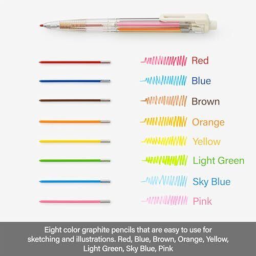 【特長】どこでもスケッチ。これ1本で8色! 【芯径】2.mm 【内蔵芯】赤・青・茶・橙・黄・黄緑・スカイブルー・ピンク 【専用替芯】赤・青・茶・橙・黄・黄緑・スカイブルー・ピンク・黒・緑・ペールオレンジ・紫 各1本 【本体サイズ】W17×D13×H140mm/16g 【材質】軸=PC クリップ=ABS 先金・チャック=真鍮 頭冠=PP 替芯ケース=AS キャップ=PE 削り器=ABS