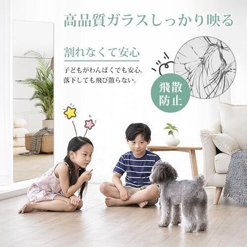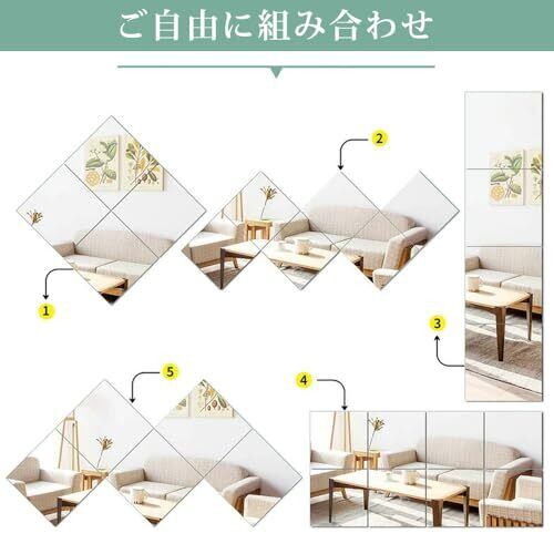 【ミラー 軽量 貼る鏡】30cm×30cm×4枚、粘着シール付属、アクリル製で割れない。飛散防止ミラーです。2mm厚でしっかりしていて非常に軽量です、フレームレス。平らな場所に貼り付け,近距離ではガラス製に近い感覚で使用可能です。 【取り付け注意事項】ミラー表面は保護シールが付いていますので、壁などに設置した後に剥がしてください。 ※保護シールをはがした後はミラー面に触らないようにしてください(指紋の跡や傷が残る場合があります)。出来るだけ汚さないよう注意が必要です。 【自由組合】4枚セットの商品で、縦に並べれば全身鏡に。ひし形でインテリアとして。一枚で髪型チェックなど配置次第で様々な使い方ができます。 鏡を設置するだけで空間が広く見えたりと、インテリアのアクセントにもなります。 【省スペース】場所は取らず、本体は軽くて,取り付けはお一人でも楽々。玄関、クロゼットのドア、洗面所、浴室、脱衣室などいろんな場所で使えます。理想の何処でも貼れる割れない姿見鏡です。貼るタイプの鏡で日常の清掃も便利です。 【安全安心】軽く落下しても飛び散ることが無い。万が一落下しても鏡に比べ怪我のリスクが低下します。地震など災害時にも割れる心配が無く,老人、小さなお子様やペットの安全対策としてもオススメです。
