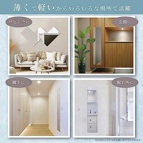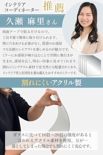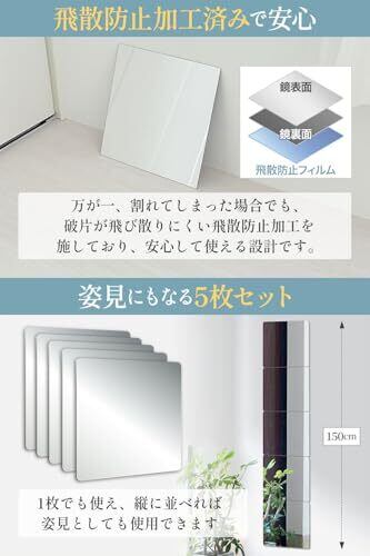 【割れにくいアクリル性】ガラスに比べて10倍〜20倍の強度があると言われるアクリル素材を使用。万が一落としてしまった場合でも割れにくく安心です。 【飛散防止加工済み】万が一、割れてしまった場合でも、破片が飛び散りにくい飛散防止加工を施しており、安心して使える設計です。 【姿見にもなる5枚セット】1枚でも使え、縦に並べれば姿見としても使用できます。 【穴あけ不要・賃貸でもOK】 貼るだけの粘着タイプで、穴あけや工具は不要。賃貸のお部屋でも、気軽に取り付けられます。 【8点固定で剥がれにくい】ミラー1枚につき両面テープを8枚使用。接着面を分散することで、剥がれにくく安定して取り付けられます。