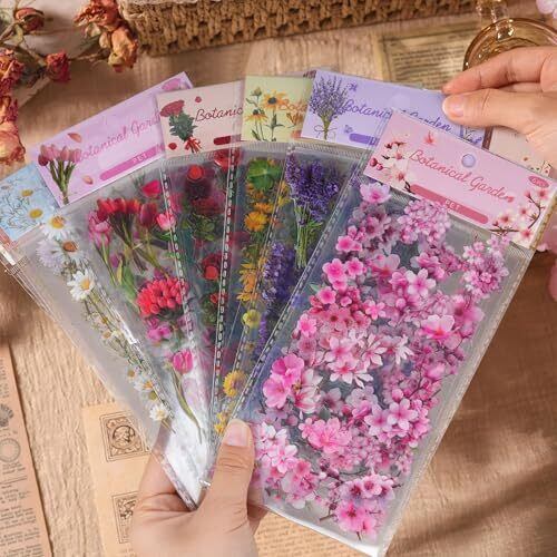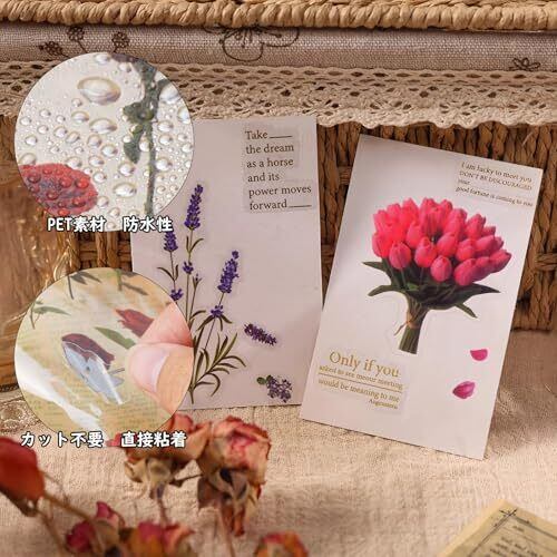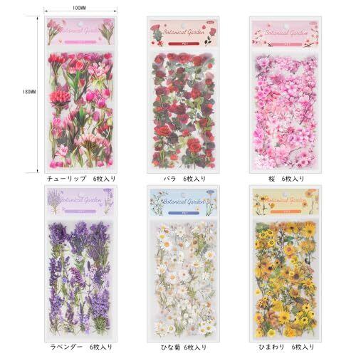 【豊富なパターン】可愛いコラージュ素材の詰め合わせセットです。桜やひまわり、バラなど様々な花が揃って、全てリアルで使いやすい図柄です 【大容量のコラージュシール】桜やチューリップ、ラベンダー、ひな菊、ひまわり、バラのステッカーは各6枚入りのセットが6冊あり、合計666枚です 【半透明防水PET材質】PET素材を作られ、優れた防水性があります。カット不要で、粘着バッキングが付き、剥がして直接使用できます 【商品情報】埃や水などの影響でステッカーの粘着力が下がるかもしれないので、貼る前には、表面をきれいにしてください 【幅広い用途】メモ用紙ノートや手帳に貼ることで、日常のアクセントになるPETステッカーです。可愛いデザインと手作り感が人気で、手帳の装飾やスクラップブック作りにぴったりです