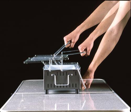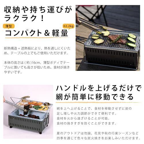 【断熱構造で卓上で使える】断熱構造+遮熱板により熱を通しにくく、テーブルの上でも使えます。 【薄型で焼きやすい】高さ16㎝の薄型ボディ。卓上に置いて使用しても焼き面の高さが低い為、焼きやすくなっています。 【軽量&コンパクト】本体は薄型でコンパクト、更に製品重量2.2㎏と軽量化、収納や持ち運びがカンタンです。 【食材を動かさずに炭の足し増しが簡単】ハンドルを上に上げることで、網が上に上がります。網を動かしたり網の上の食材を移動させたりせずに、炭の足し増し・火力調節ができ便利です。 【食材の焼きすぎを防ぐ】網を上に上げることで、食材を火から離し、焼きすぎを防ぎます。 【原産国】日本 【サイズ】本体/約W37×D25.5×H16cm、ナカゴ内寸/約W27.5(24.2)×D14(10.3)×H9.5cm、ロストル/約24.7×10.5cm、焼網/約35×21cm