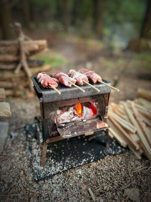 ※グリルプレート、ロストルは酸洗鉄板に表面加工を一切しておりませんので、最初から若干の錆や加工過程にできる傷、打痕や汚れ等がついてしまう事がありますので、あらかじめご了承ください。 B-6君本体とグリルプレート、ハードロストルの3点セット。本体は折りたたむと厚み18mmになる超うす型コンパクト設計。ツーリングやハイキングにも便利な500gのポケットサイズ焚き火台です。 焼き料理に最適な2.3mm厚の酸洗鉄板プレートと、頑丈なロストルをセットにしました。